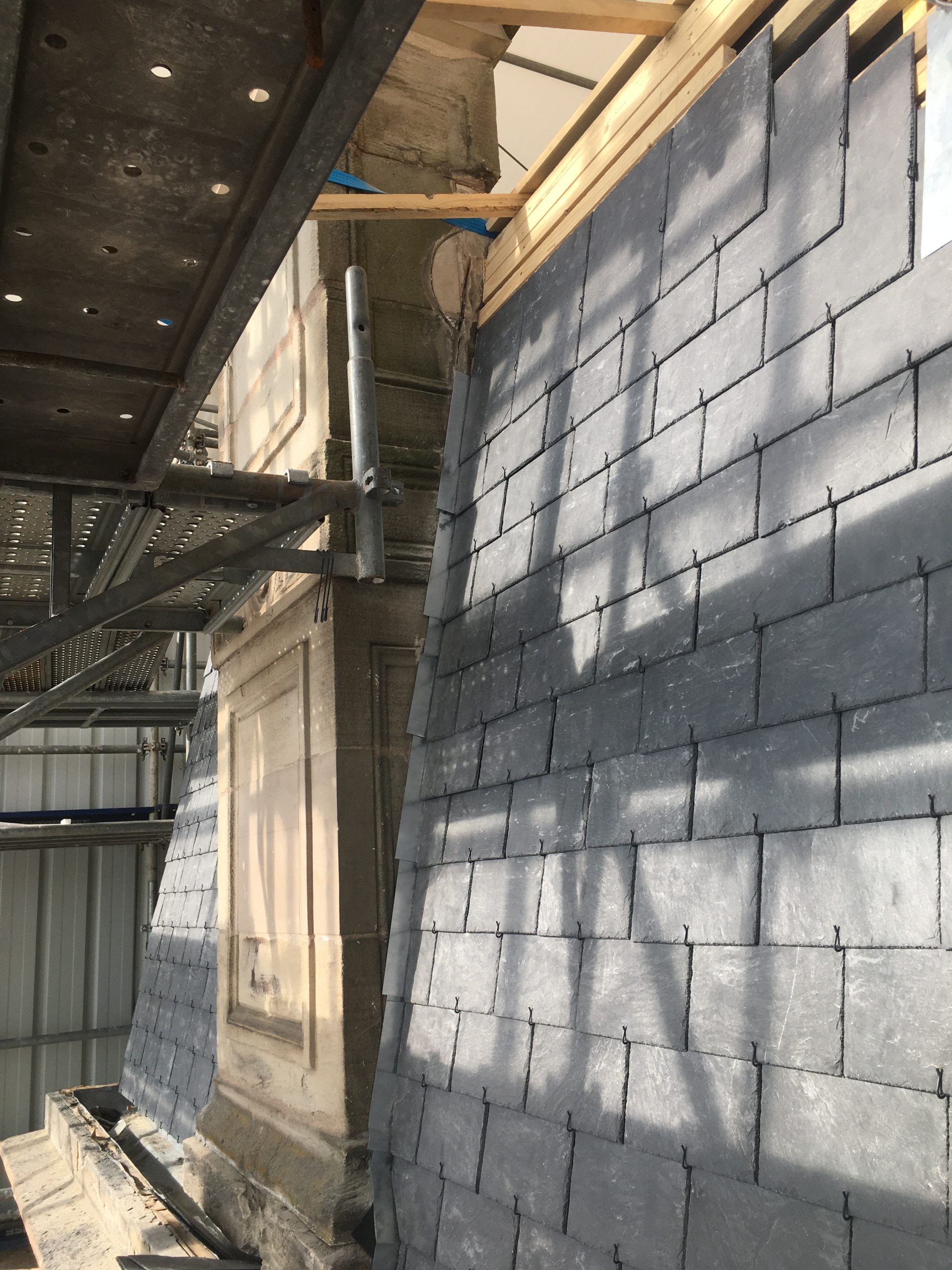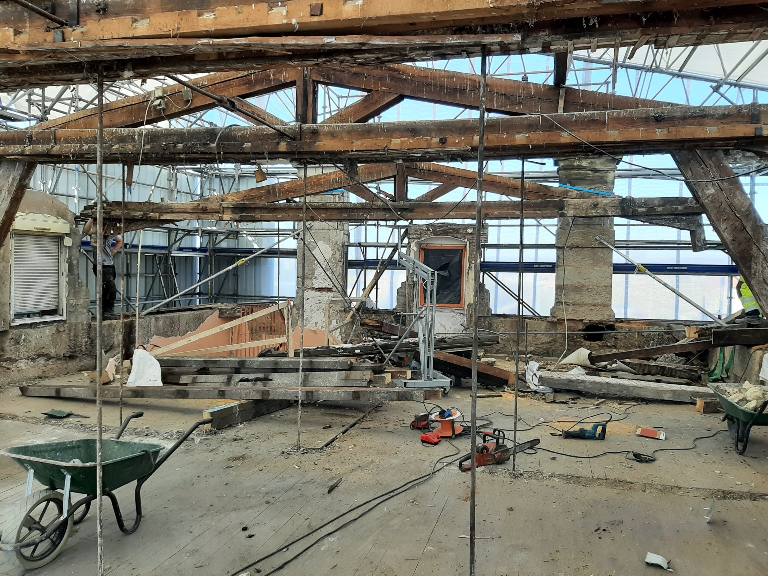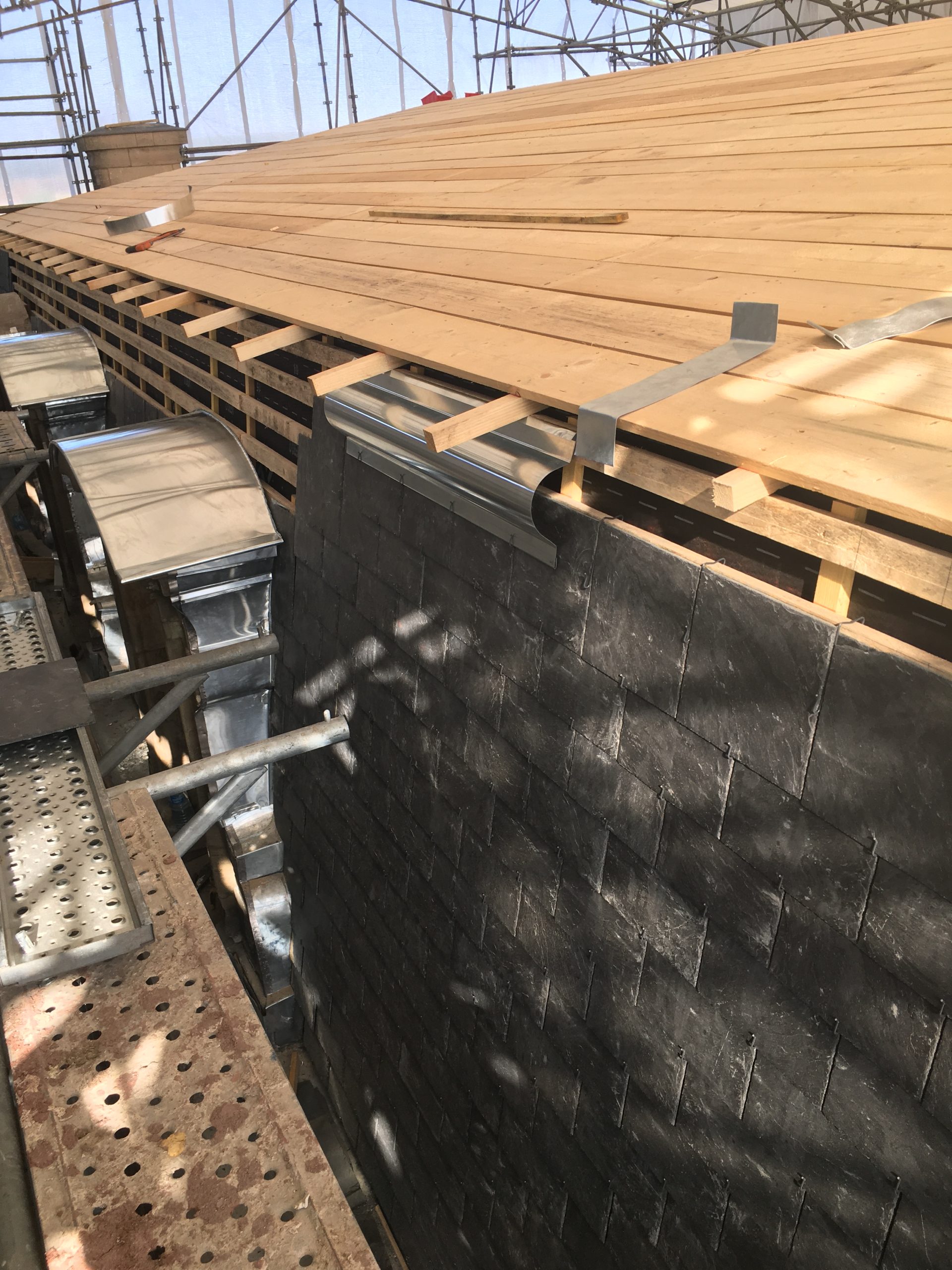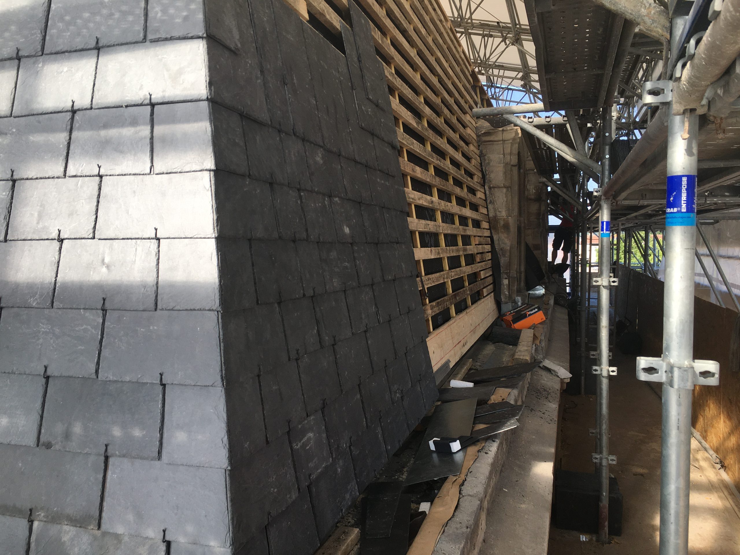 Remplacement d’une charpente traditionnelle comprenant les fermes, les arêtiers, les pannes et des tirants métalliques 14 M3, réalisation d’une MOB sur la partie brisis de 154 M2, réalisation d’une couverture à joint debout 170 M2, réalisation d’un brisis en ardoises naturelles 120 M2, réfection des habillages des lucarnes et de l’horloge (jouées – couronnement) 8 U, refections des zingueries (Descentes EP, membron, couvertines) 94 M2, isolation thermique en déroulée 170 M2
