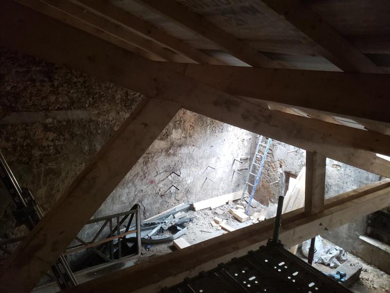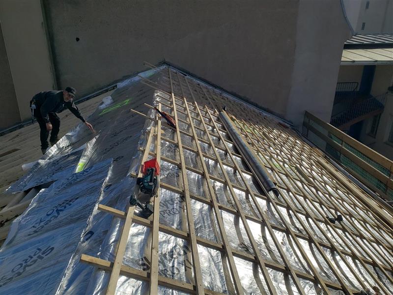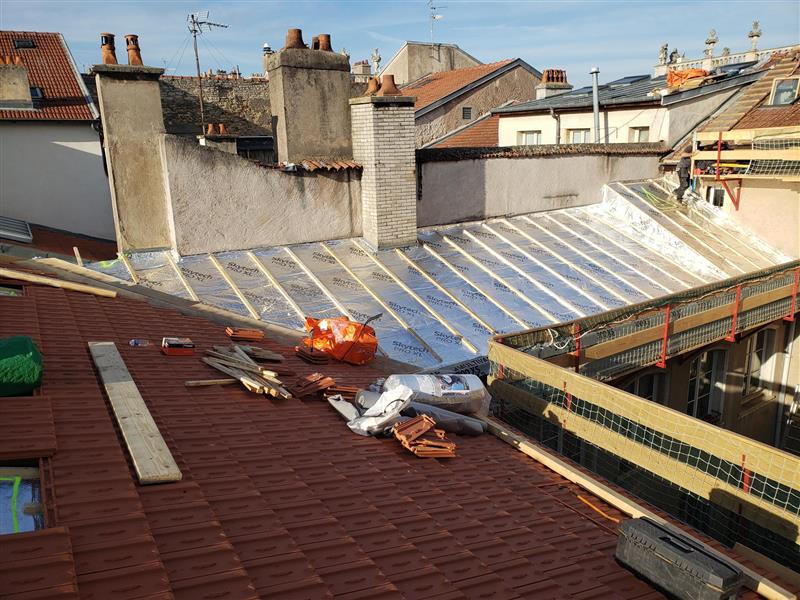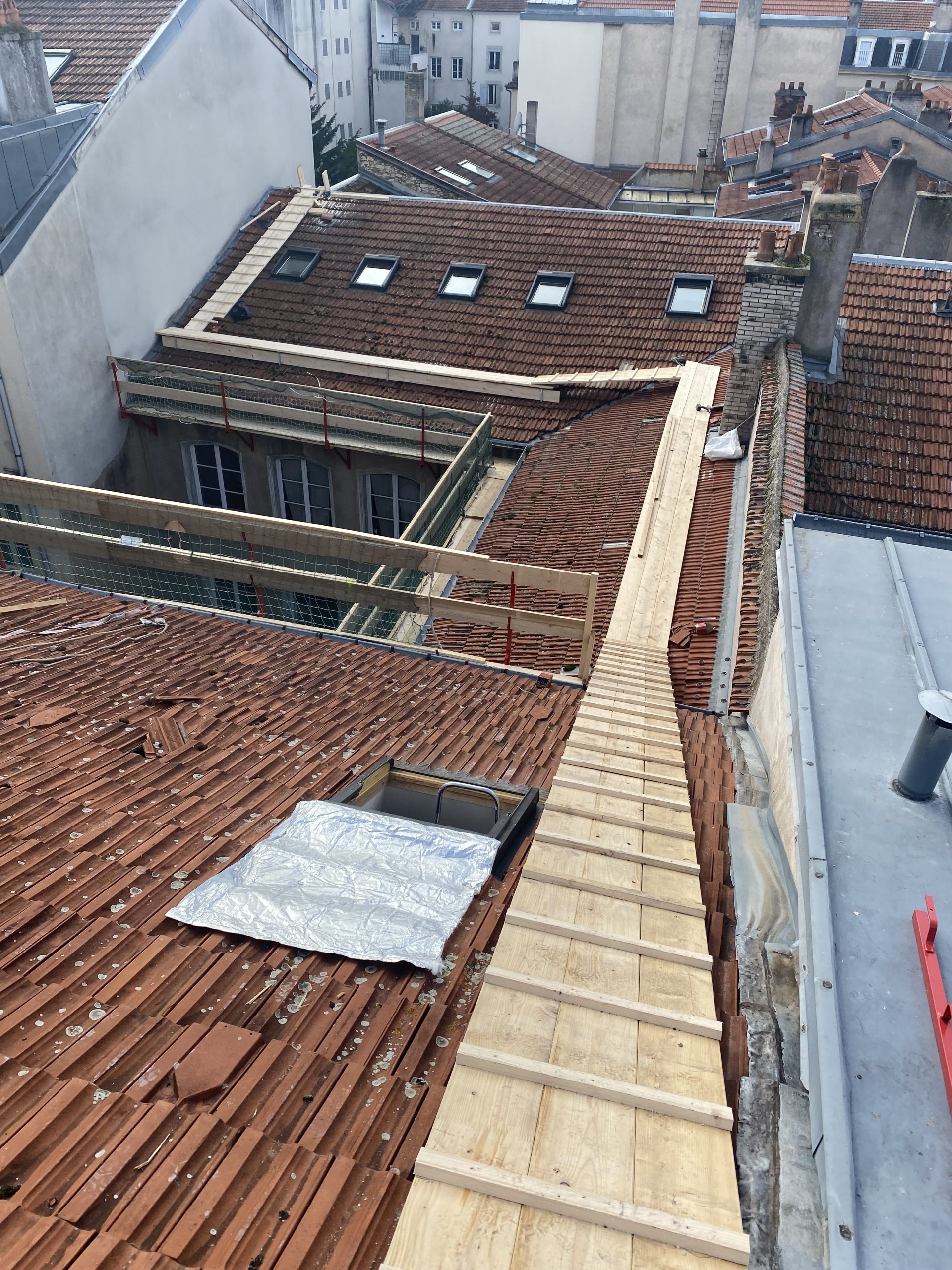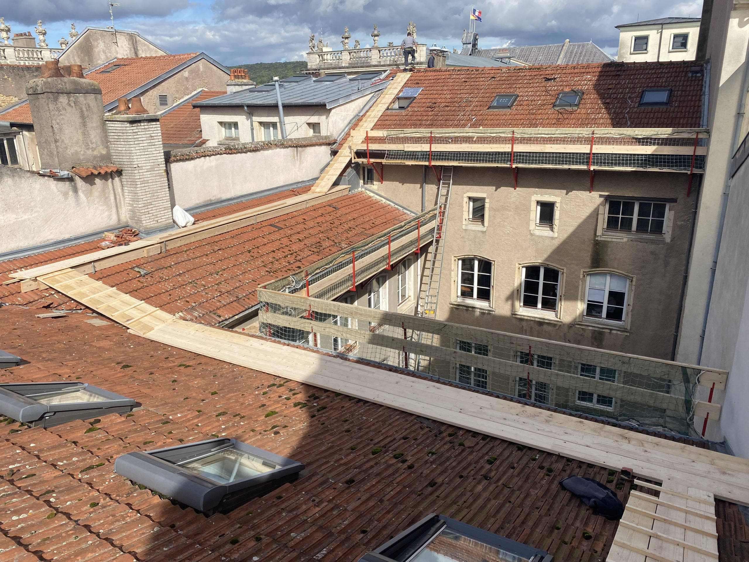 Réfection de 4 couvertures en tuiles terre cuite pour une surface totale de 399 M2, remplacement de 2 charpentes traditionnelles comprenant ferme, pannes et chevrons 3,5 M3, sur 1 bâtiment renforcement par moiseage de panne 1 M3, réfections des zingueries (Noues, rives, solins, faitages) 103 m, remplacement des EP gouttières 54 m – descentes 63 m, réfection des corniches en bois 33 m, remplacement de fenêtre de toit 15 U