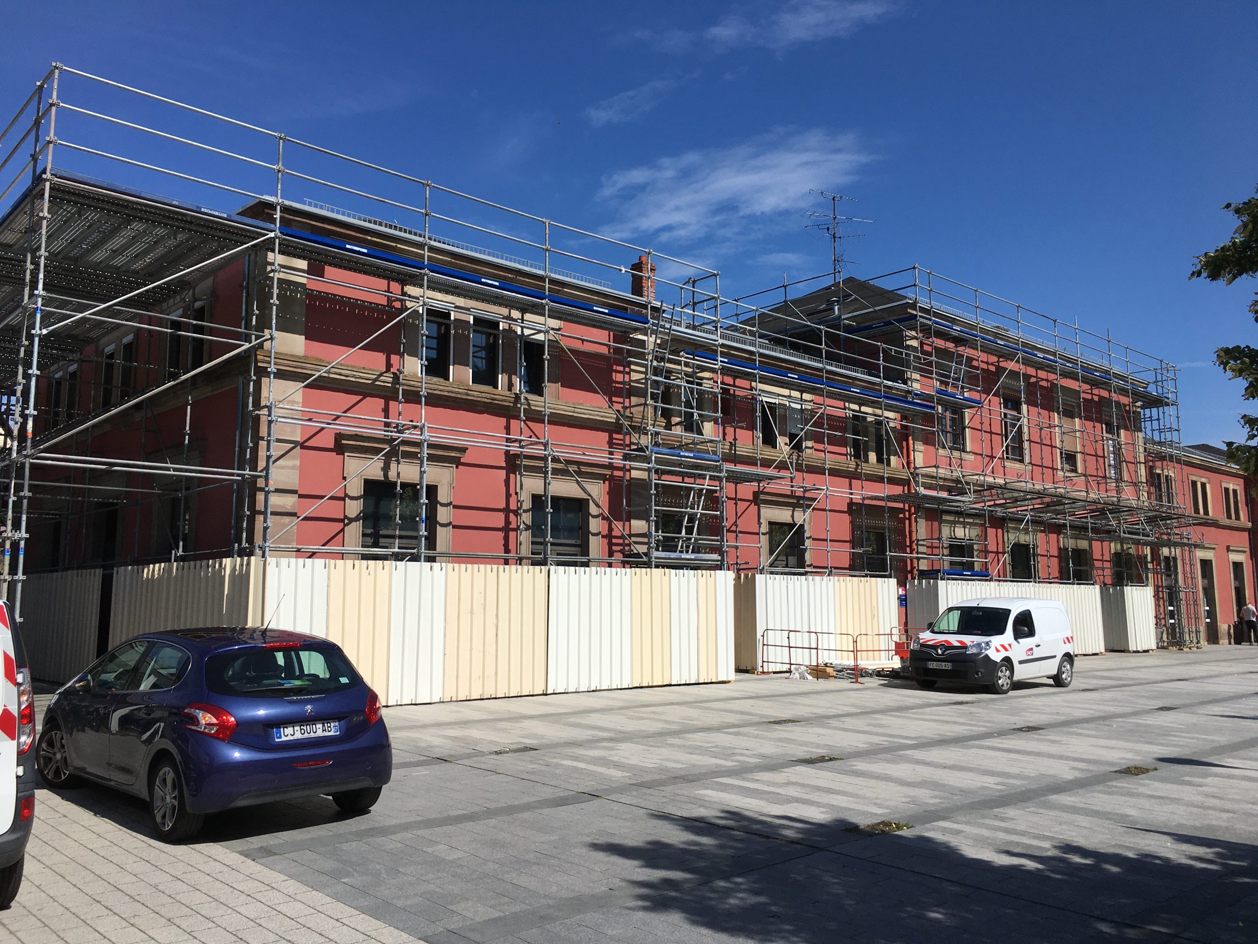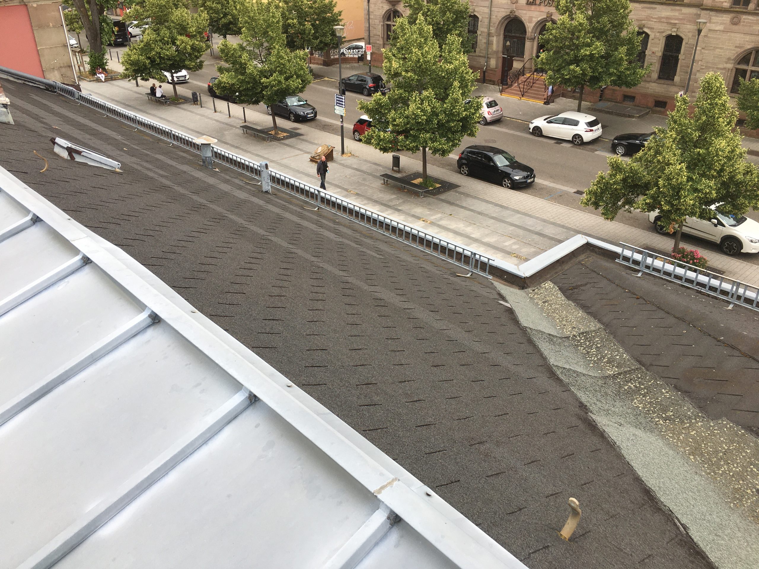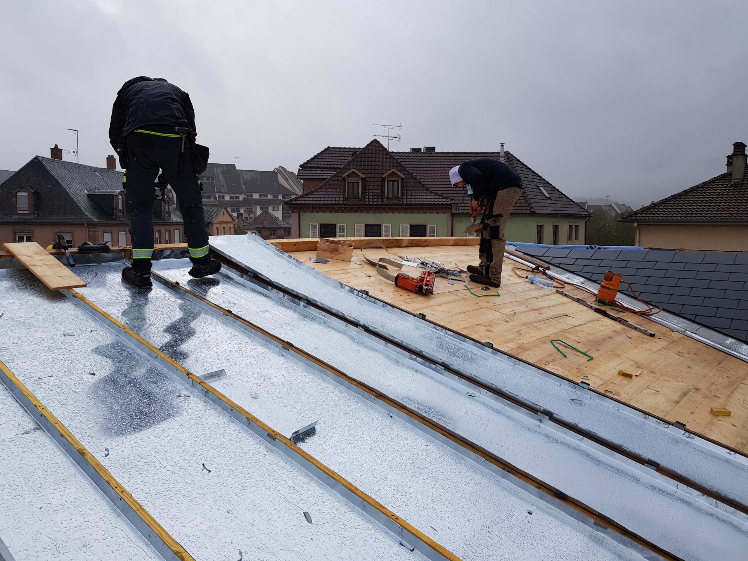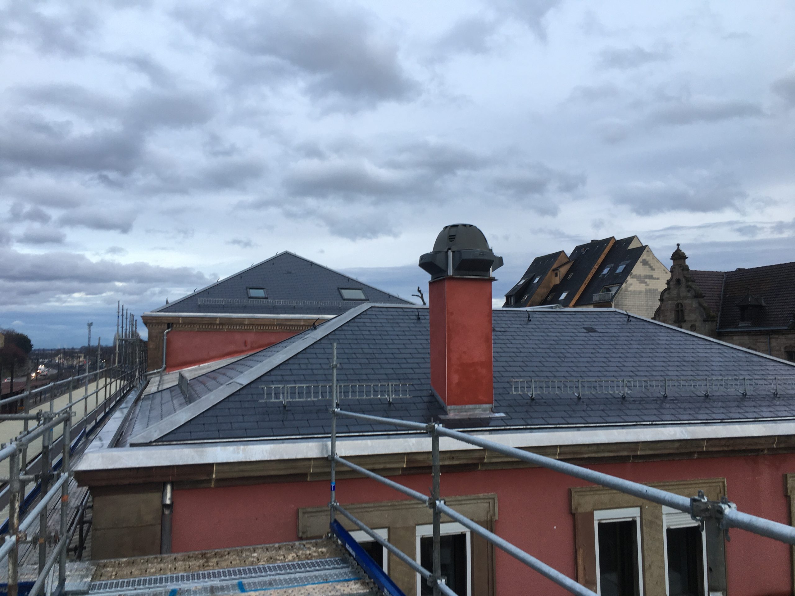 Réfection de couvertures en ardoises fibres-ciment rectangulaire pour une surface totale de 631 M2, réfection de couverture en zinc à joint debout 239 M2, travaux de renforcement de charpente par moiseage 2,500 M3, reprise de fissure sur charpante avec application de résine epoxy 100 m, réalisation d’un traitement de charpente par injection et pulvirisation, réalisation d’une isolation thermique déroulée en combles 243 M2, réfections des zingueries (Noues, rives, solins, faitages) 250 m, habillage des jouées de lucarne rampante 1 U, refections des EP gouttières 3 m – chéneau 200 m Descente 65 m, Réalisation d’une ligne de vie 31 m, réfection d’un plancher bois 440 M2, remplacement 10 fenêtres de toit, création d’exutoires de désenfumage 2 U
