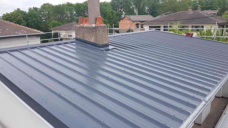 Réfection d'une toiture en tôles fibrociment amiantées par une une couverture en zinc à joint debout anthracite avec création de fenêtres de toit Velux sur costières...